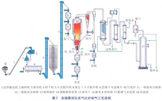 灰熔聚流化床氣化爐采用傳質、傳熱效率較高的流化床處理粉煤,粉煤與氣化劑在底部濃相區進入氣化爐即開始發生反應,煤在氣化爐內一次實現破粘、脫揮發分、氣化、灰團聚及分離、焦油及酚類的裂解等過程,煤熱解與氣化產生的煤氣均通過了高溫區域發生裂解,幾乎不產生焦油、酚類物質及有機硫化物。