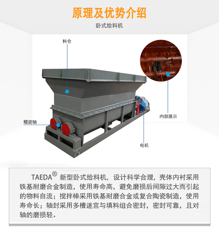 臥式給料機是一種新型高效給料設備,按照原料特性,分為滑架式破拱給料機(適用于高粘度物料的攪拌打散給料),圓盤給料機(適用于顆粒類流動性好的原料),多軸均勻給料機(適用于生物質原料),雙軸打散給料機(適用于煤泥類原料),膠帶箱式給料機(適合于通用性原料)。泰達會根據不同物料配置適合的臥式給料機,實現連續(xù)的或不間斷的供料輸送,并且具有較大的暫存緩沖作用,儲料量一般在10m3以上。全系列臥式給料機都采用耐磨特性材料,具有結構合理,堅固耐用,運轉平穩(wěn)等特點,廣泛用于工礦企業(yè),是比較理想的連續(xù)給料輸送設備。